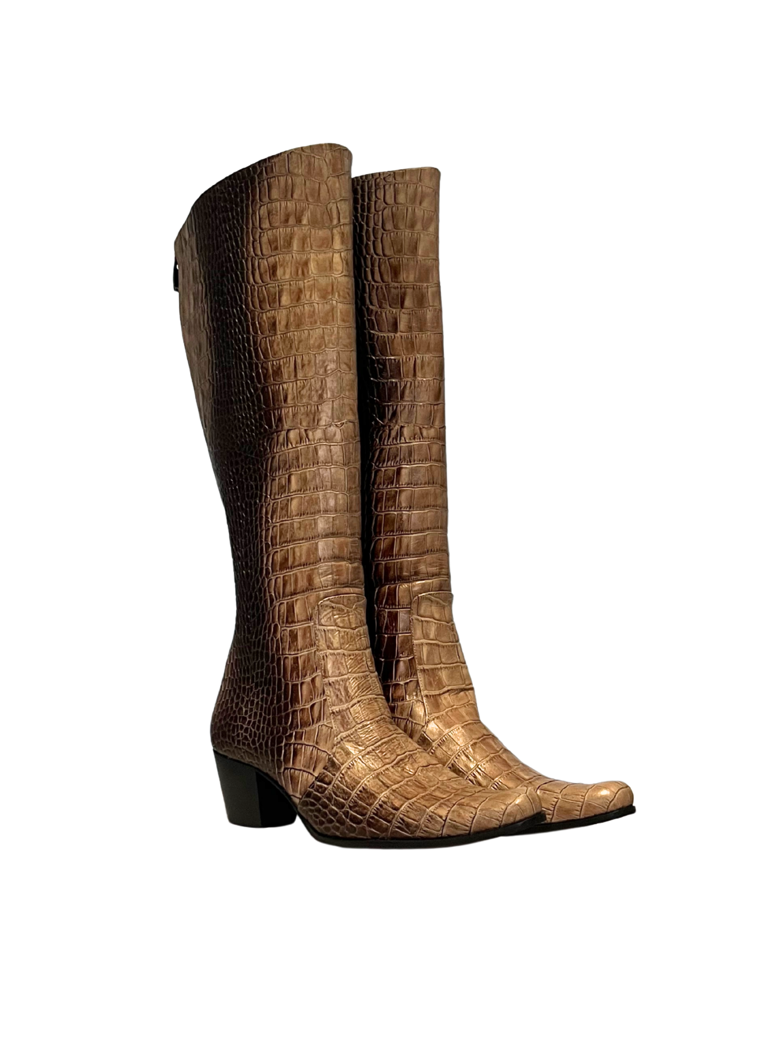 Classic & Timeless, Rockwell Tharp's Sedona Knee High boot is a two-tone embossed leather with warm mocha & beige hues. The Perfect Knee High boot for any occasion. Rockwell Tharp's elegant boots are hand-crafted & comfortable.