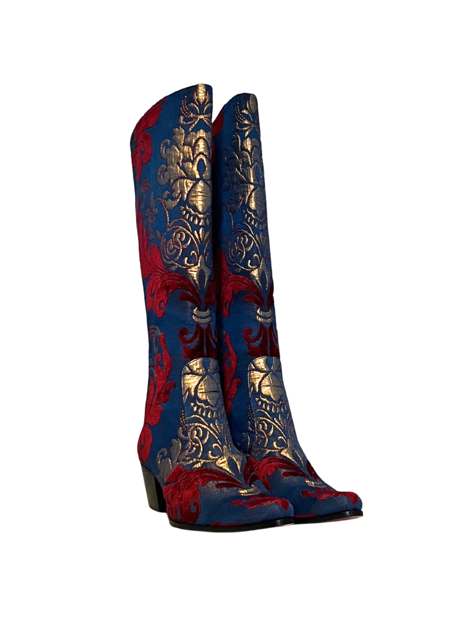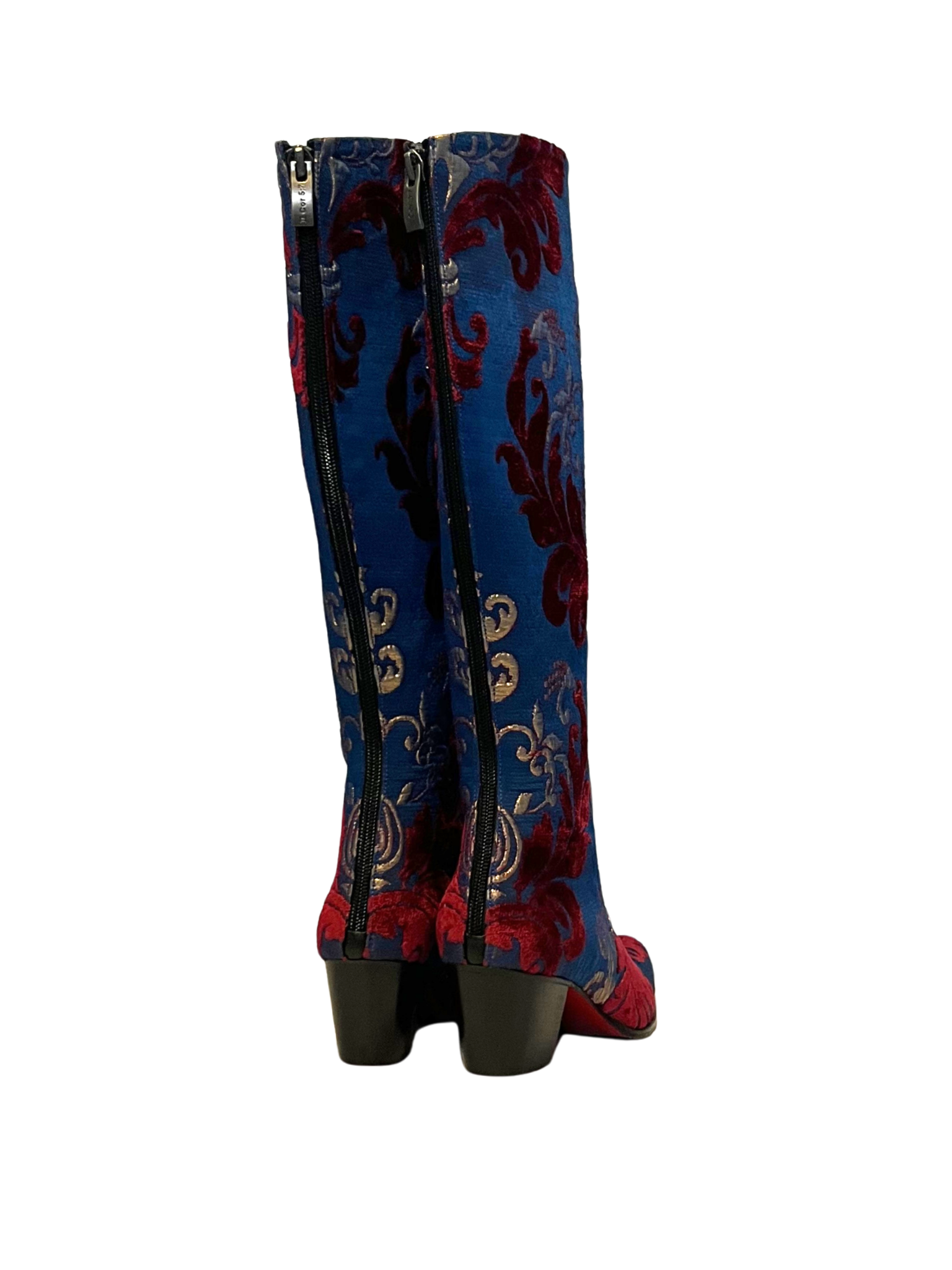 Selected from thousands of textiles by our design team, the Seville Knee High is a Gorgeous Pair! Shades of Cranberry & Gold throughout the classic Navy Blue Brocade make this a Stunning Boot!