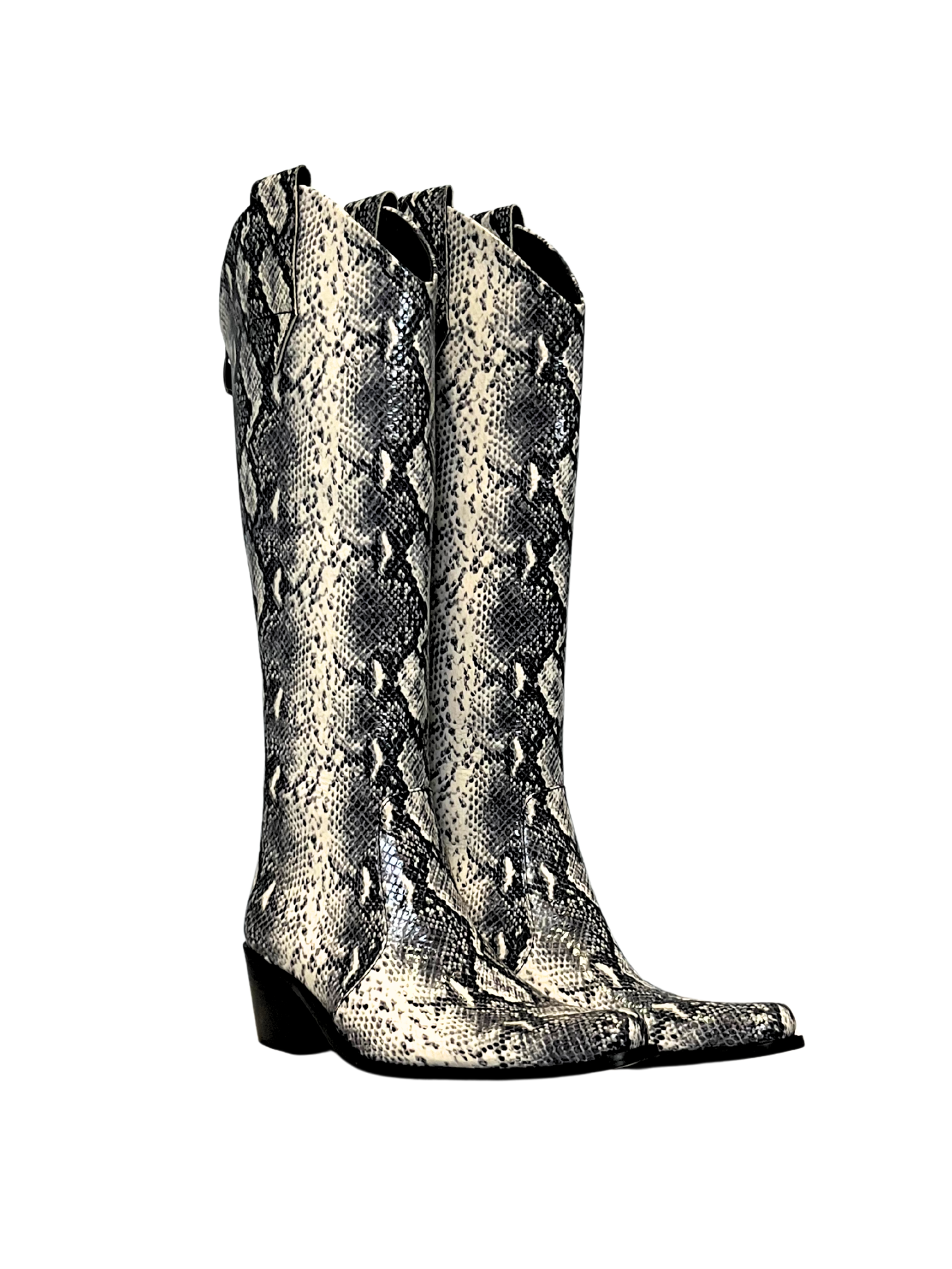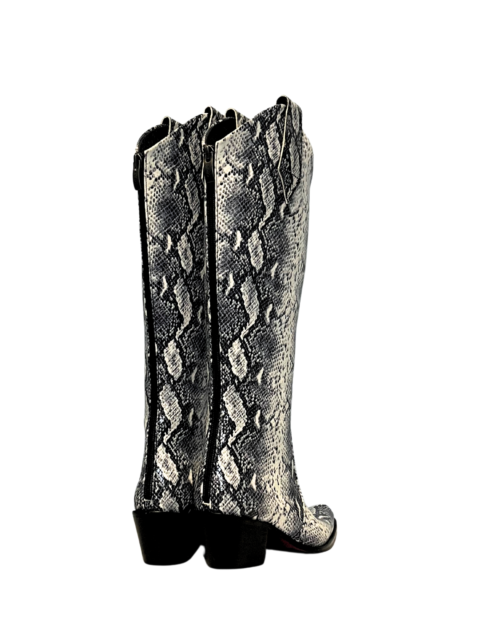 Selected from thousands of textiles by our design team, the Silverado V-Line is a Gorgeous Pair! Shades of White, Black & Gray throughout this classic Python Embossed Leather make this a Stunning Boot!