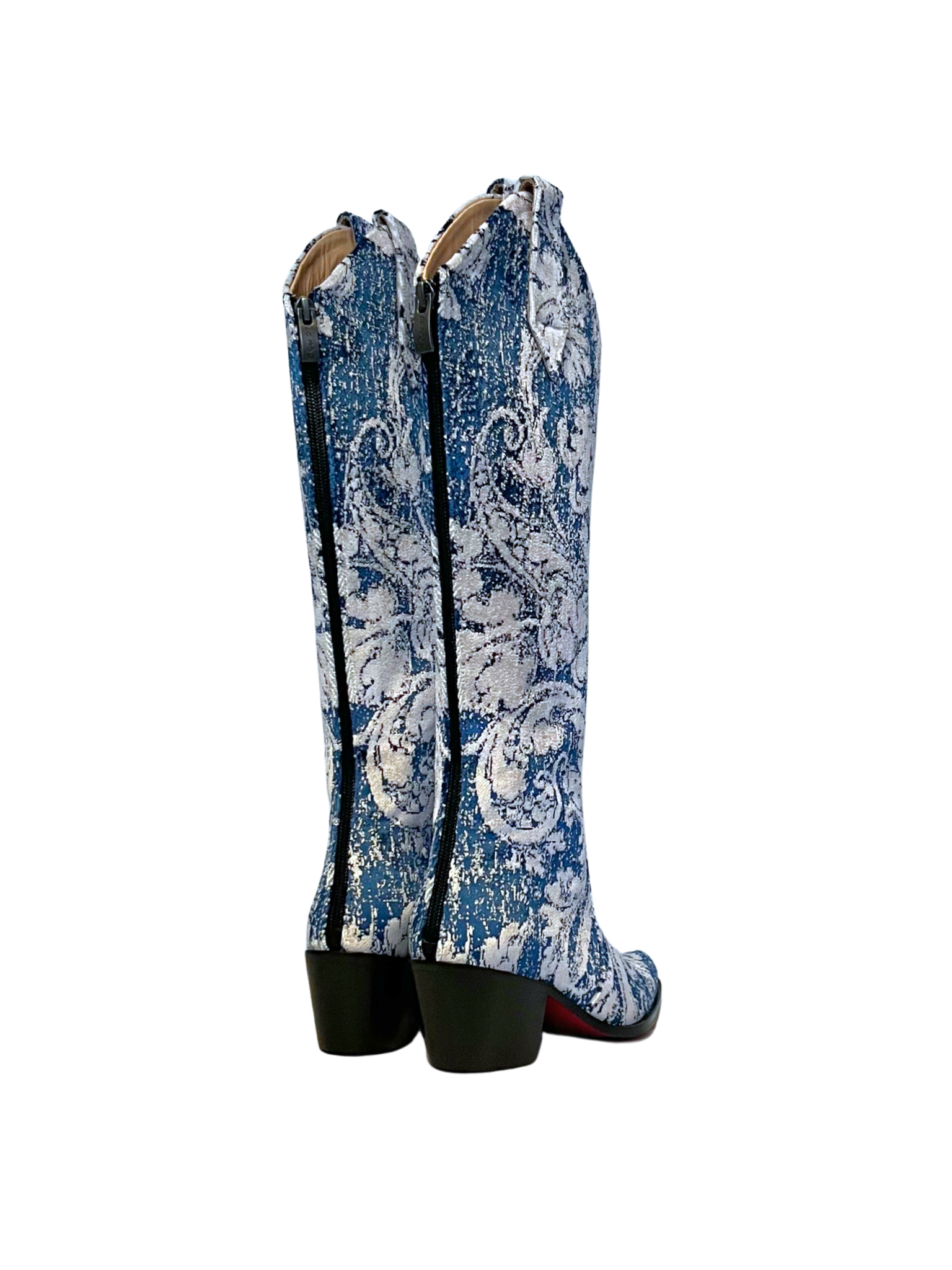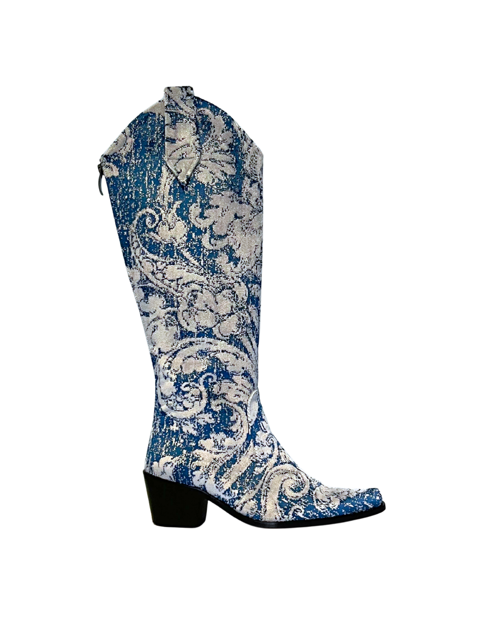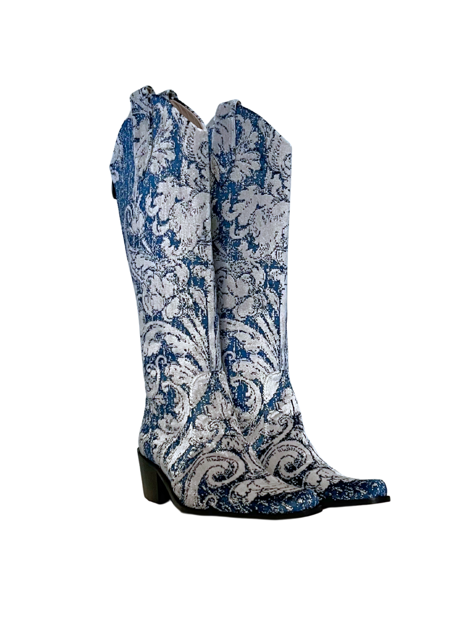 Rockwell Tharp's Trinity Boot is part of our fabulous V-Line Collection! Beautiful detail in this pair with Denim Blues and White floral accents. This new collection is not only beautiful, but comfortable too!