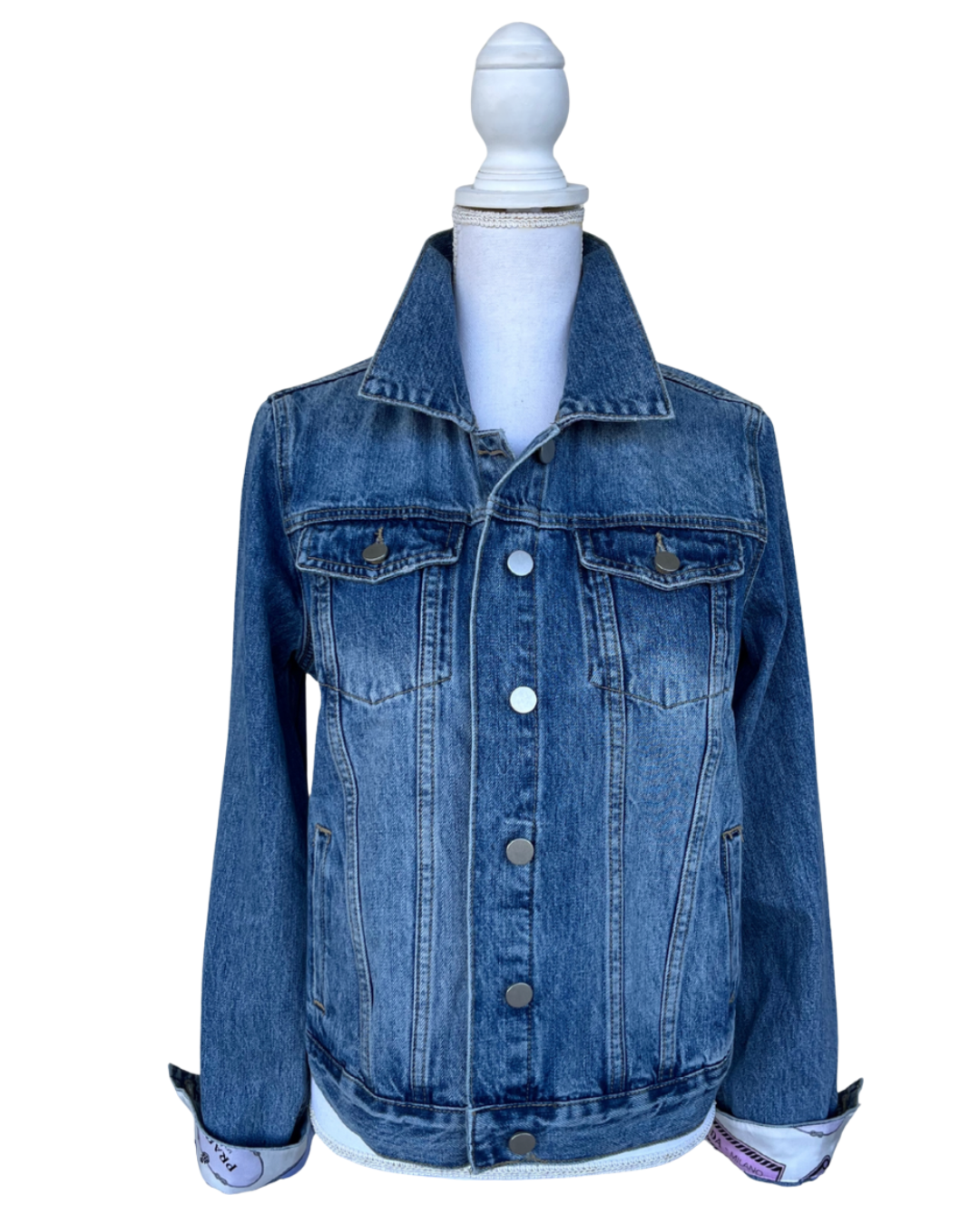 Rockwell Tharp is excited to be an exclusive carrier of these beautiful denim jackets with authentic scarves! This P jacket is on classic denim with a purple Logo scarf.