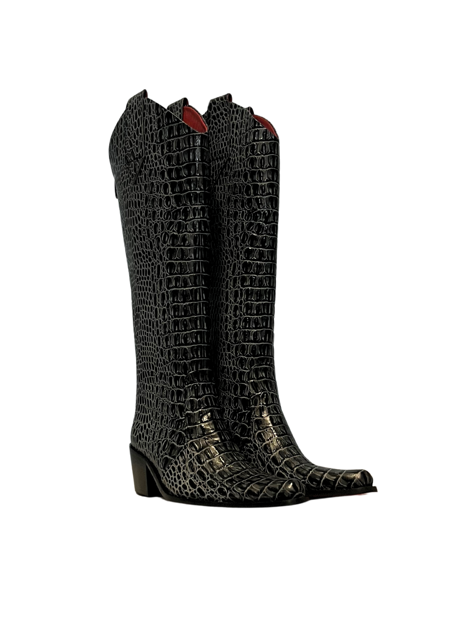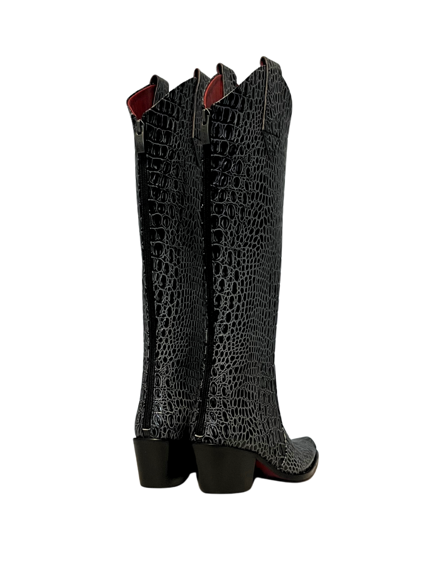Rockwell Tharp's Windsor V-Line Collection has Beautiful detail with the black & charcoal crocodile embossed leather. This boot is not only beautiful, but comfortable too!